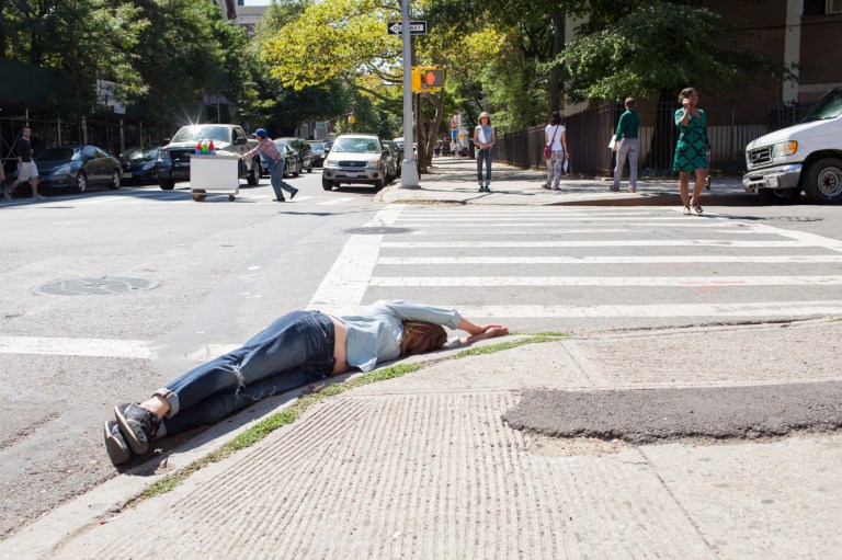 Andrea Haenggi is leading the participants through a somatic fake/real car crash movement exploration and then they went into the streets to make the pictures: these are some of the participants statements: