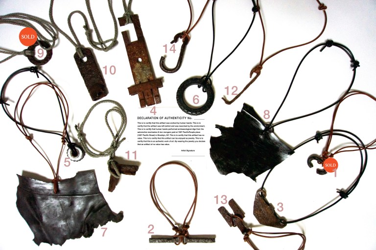 The art jewelry by artist Andrea Haenggi questions what do we value – when does an object becomes refuse and when it gains value again. The artifacts were gathered from the soil and through archaeological dig at 1067 Pacific Street in Brooklyn – a former auto repair place owned by an Italian Auto Repair man called Frank for over 40 years. The found objects reflects history of the neighborhood block car and iron industry. Every day you wear the art jewelry you will feel an historical artifact of no value has value.